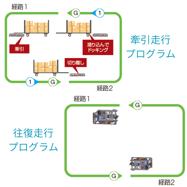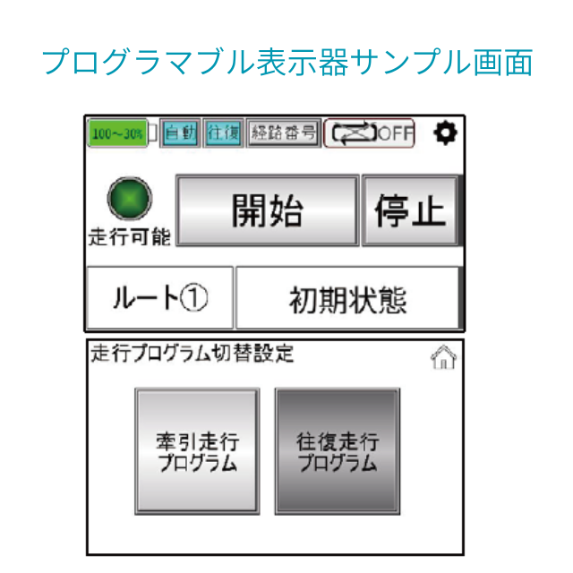 プログラマブル表示器用のサンプル画面のほか、PLC用のサンプルプログラム(2地点間往復走行、牽引走行)をご提供 。これらを活用することで、開発工数を削減し、迅速な立ち上げを支援します
