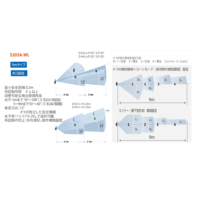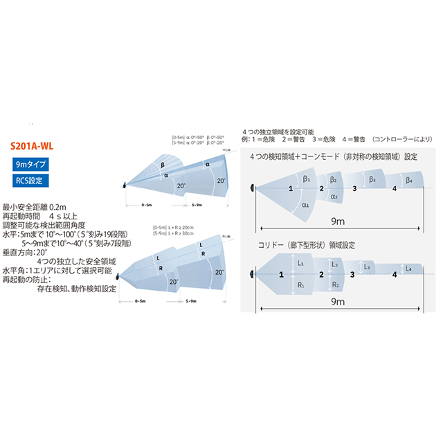 水平角度の範囲 | 10~100°(W、WL:0~5m) 10~40°(WL:5~9m) |