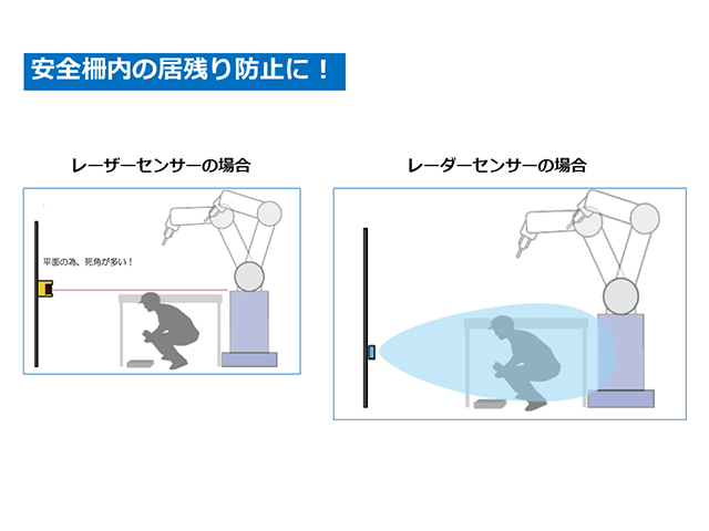 ①安全柵内の居残り防止対策。息があれば、転倒している人も検知可能です。
