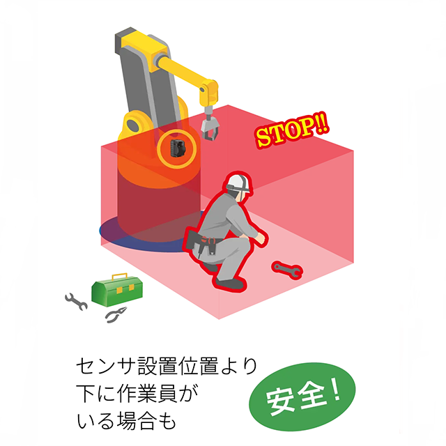 | 3Dエリア設定 | これまでの3D測域センサでは、エリア設定機能がなかったため、お客様にて一からのソフト処理が必要でした。また、2D測域センサでは、センサ設置位置の上下にいる障害物を検知することができませんでした。 しかし、これらの問題を3次元のエリア設定が解決! 「3D測域センサ」「エリア設定」2つの機能を兼ね備え、センサ設置位置上下にある障害物の検知を可能に。 |