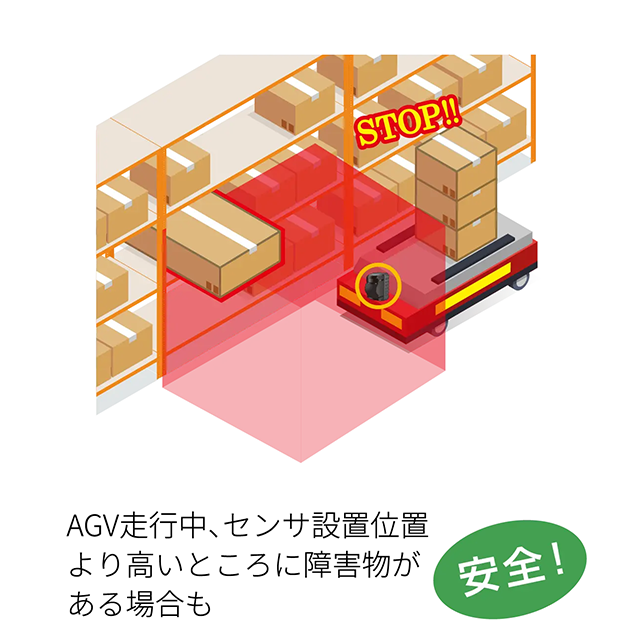 AGVやAMR、フォークリフト、協働ロボットの周囲監視、安全対策用途に特に向いています。上下方向の立体障害物検出が可能なため、「人や物がセンサ下にもぐり込むような状況」に対して効果的です。※安全認証品ではございませんので、十分なリスクアセスメントのうえご使用お願いします。