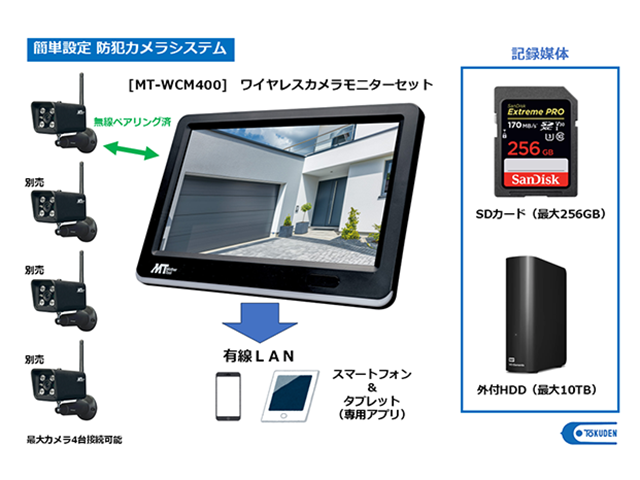 防塵・防水仕様のワイヤレスカメラ1台とモニターのセットで、配線工事や面倒な設定は不要。ご購入後すぐに使用できます。